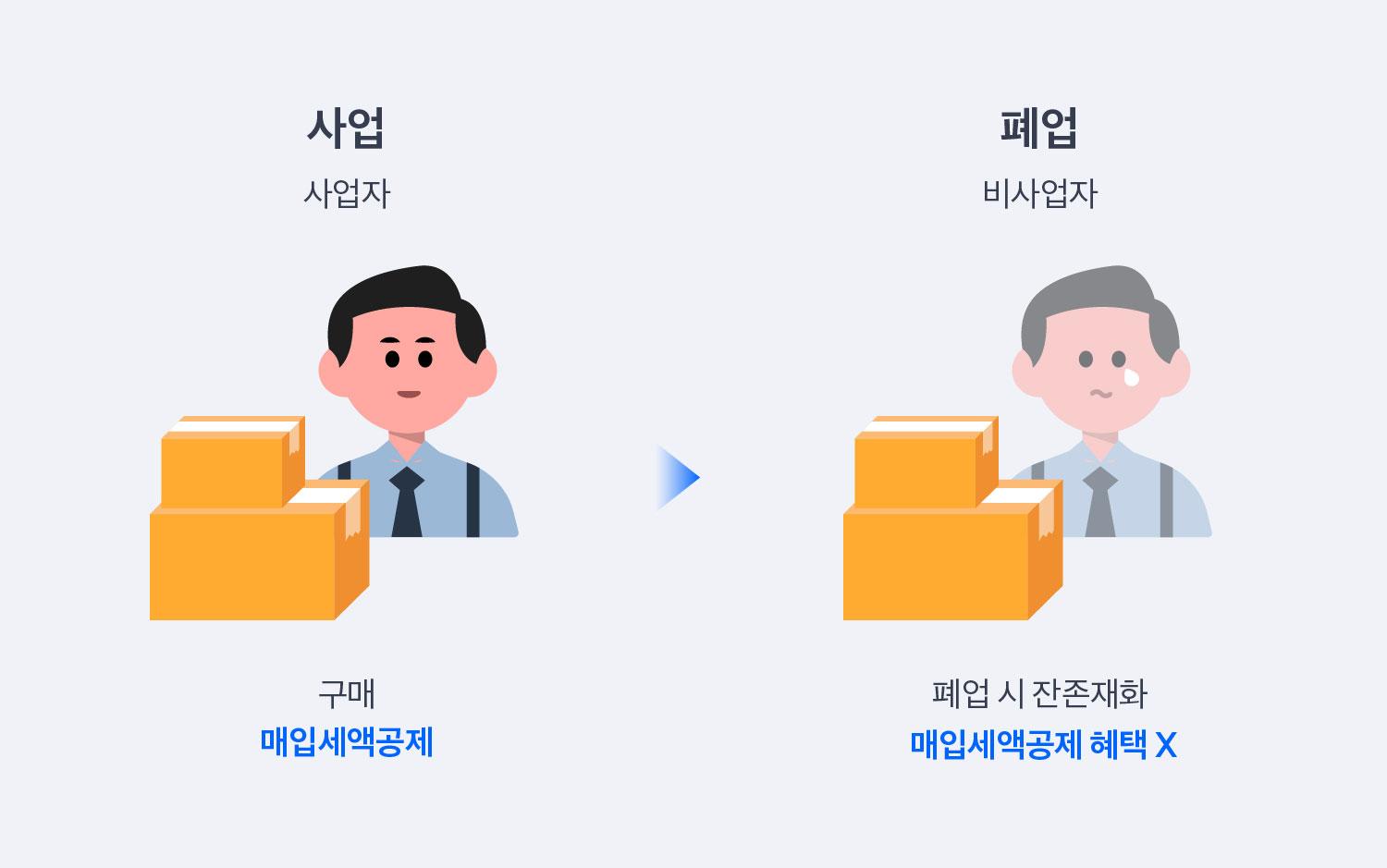 여기서 핵심은 사장님이 사업자만 받을 수 있는 매입세액 공제 혜택으로 물건을 구매했다는 겁니다. 보통의 개인은 받지 못하는 혜택이죠. 폐업을 하게 되면 잔존재화가 개인의 몫으로 인정되기 때문에 사업자에게 제공한 혜택을 거둬들이는 개념이라고 생각할 수 있습니다.