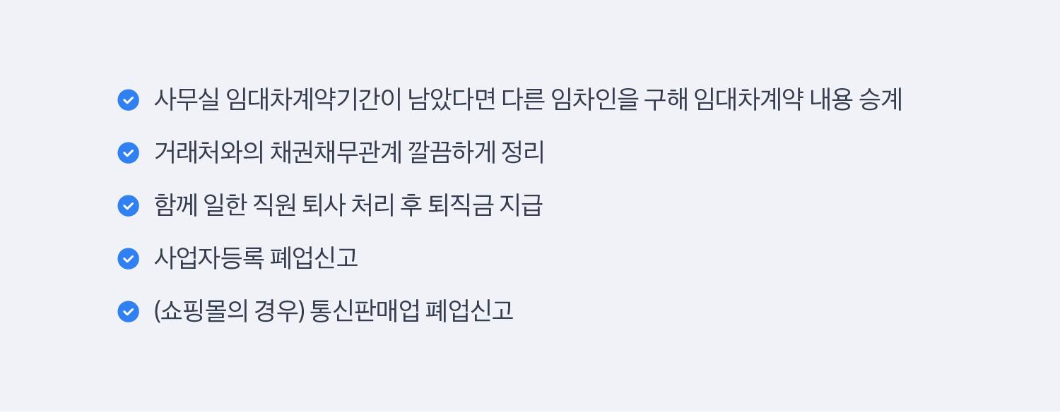 사업을 마무리할 때도 ‘절차’가 있다는 사실 알고 계신가요? 사업자등록, 통신판매업 등록, 사무실 임대 등 사업 시작을 위해 절차를 밟았던 것처럼요.