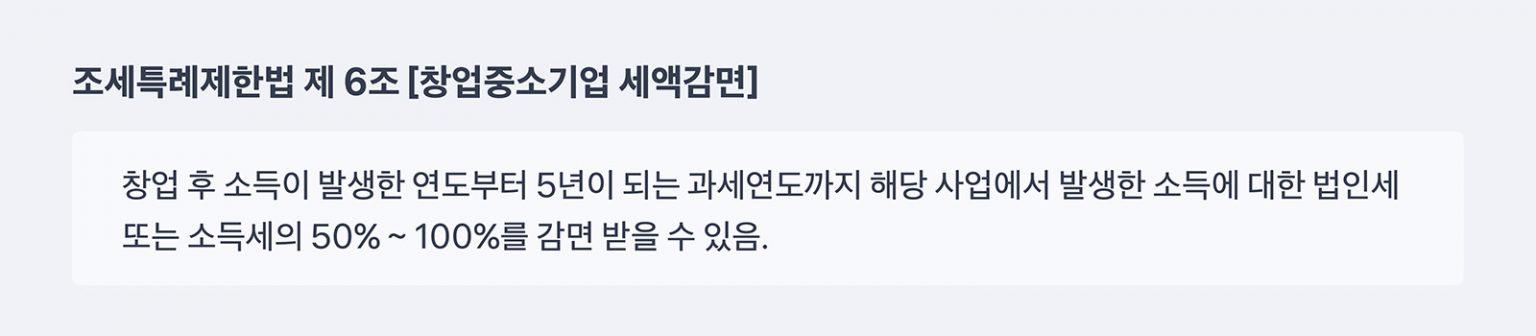 그런데 4가지 조건에 해당하지 않더라도 너무 안타까워하지 마세요. 조세특례제한법 제 6조에서 규정하고 있는 창업 중소기업 세액 감면 제도는 “해당 사업에서 발생한 소득에 대한 법인세 또는 소득세의 50%~100%를 감면받을 수 있음”이라고 규정합니다. 100%는 아니더라도 절세 혜택을 누릴 수 있는 분들이 있다는 것이죠.