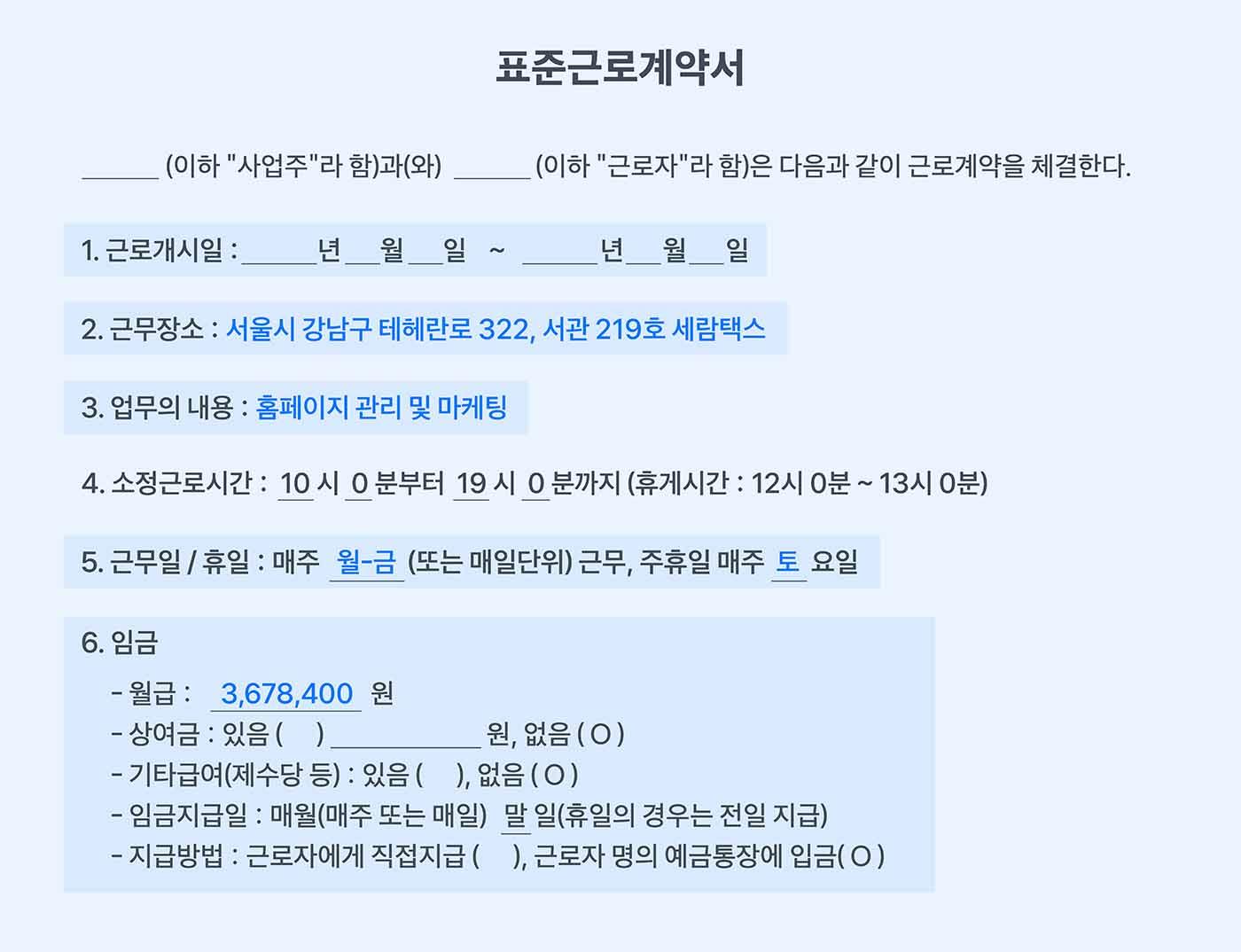 저는 제가 운영하는 회사의 특성에 맞게 바꾼 근로계약서를 만들어 사용하고 있지만, 채용을 처음 하시는 사장님께서는 인터넷에서 공유된 표준근로계약서를 활용하실 텐데요. 어떤 근로계약서라고 해도 상관 없지만, 세 가지는 꼭 계약서에 포함돼야 합니다.