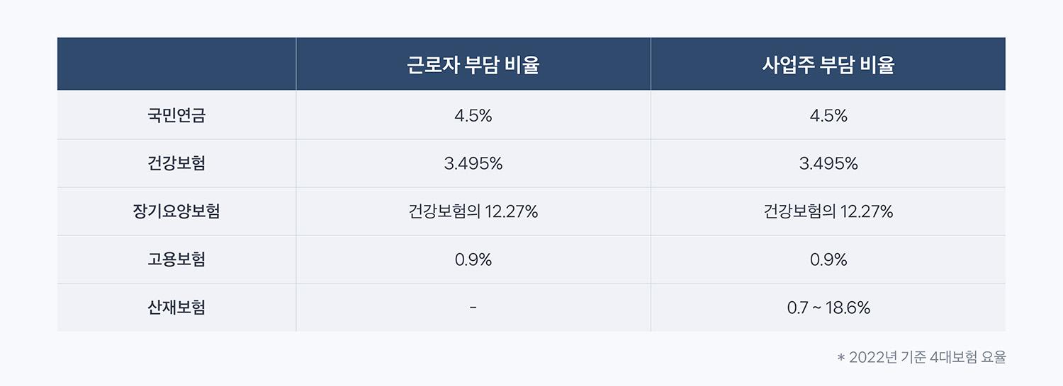 결과적으로 직원을 채용하게 되면, 직원 월급 외에도 추가적으로 직원 월급의 9.5% 가량을 4대보험으로 납부해야 해요. 아무래도 초기 사업주는 부담스러운 금액일 수 있죠.
