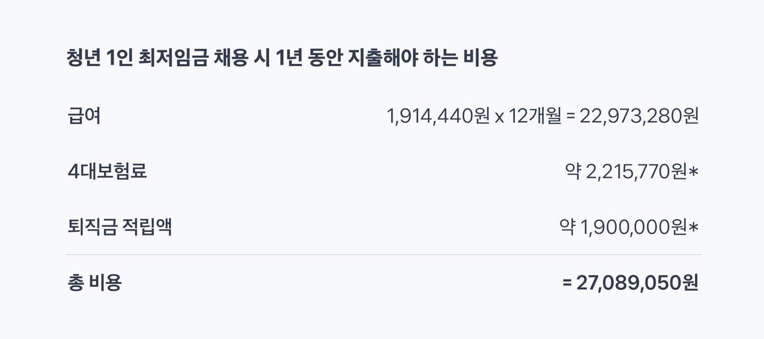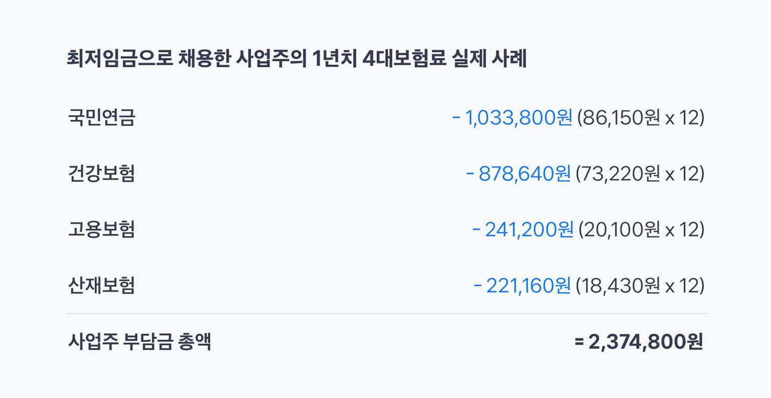 채용을 고려하는 사장님, 고민이 많이 되시죠? 채용을 하려고 근로계약서나 4대보험처럼 기본적으로 필요한 것을 확인하긴 했는데, 비용이 많이 들지 않을지 걱정되실 겁니다. 저도 매년 올라가는 최저임금에 한숨이 나오고, 매달 내는 4대보험을 보면 ‘직원 2명분 월급인데’ 하며 아까운 마음이 들기도 하더라고요.