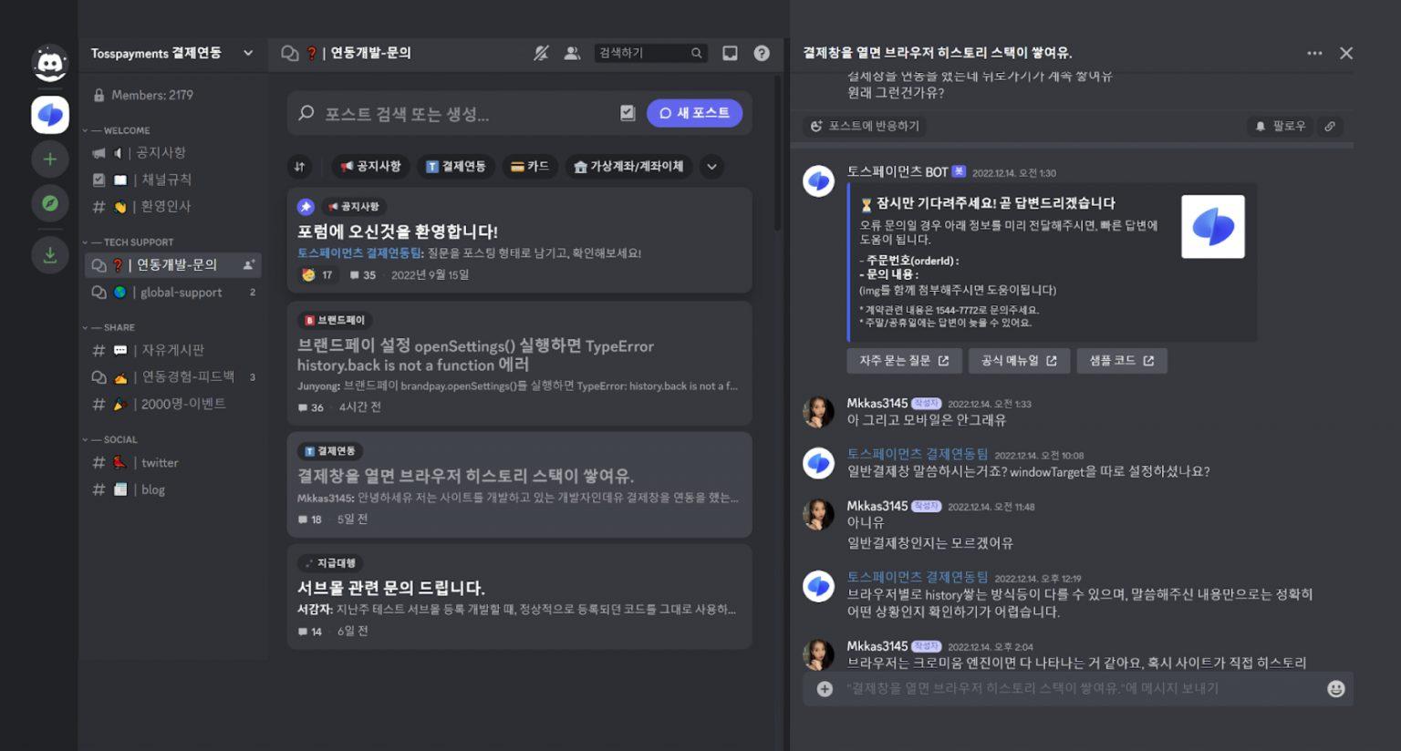 “우선 실시간 대응이 어려운 일반 게시판과 달리 이곳에서는 문의 답변이 빠르게 와서 편하더라고요. 개발자 특성일 수도 있는데, 유선 소통이나 긴 글로 커뮤니케이션하는 게 조금은 부담스럽기도 한데요. 디스코드는 메신저 기반인 덕분에 ‘문의 글’을 길게 남기는 게 아니라 ‘채팅’을 할 수 있어서 참여가 더 쉬워요.