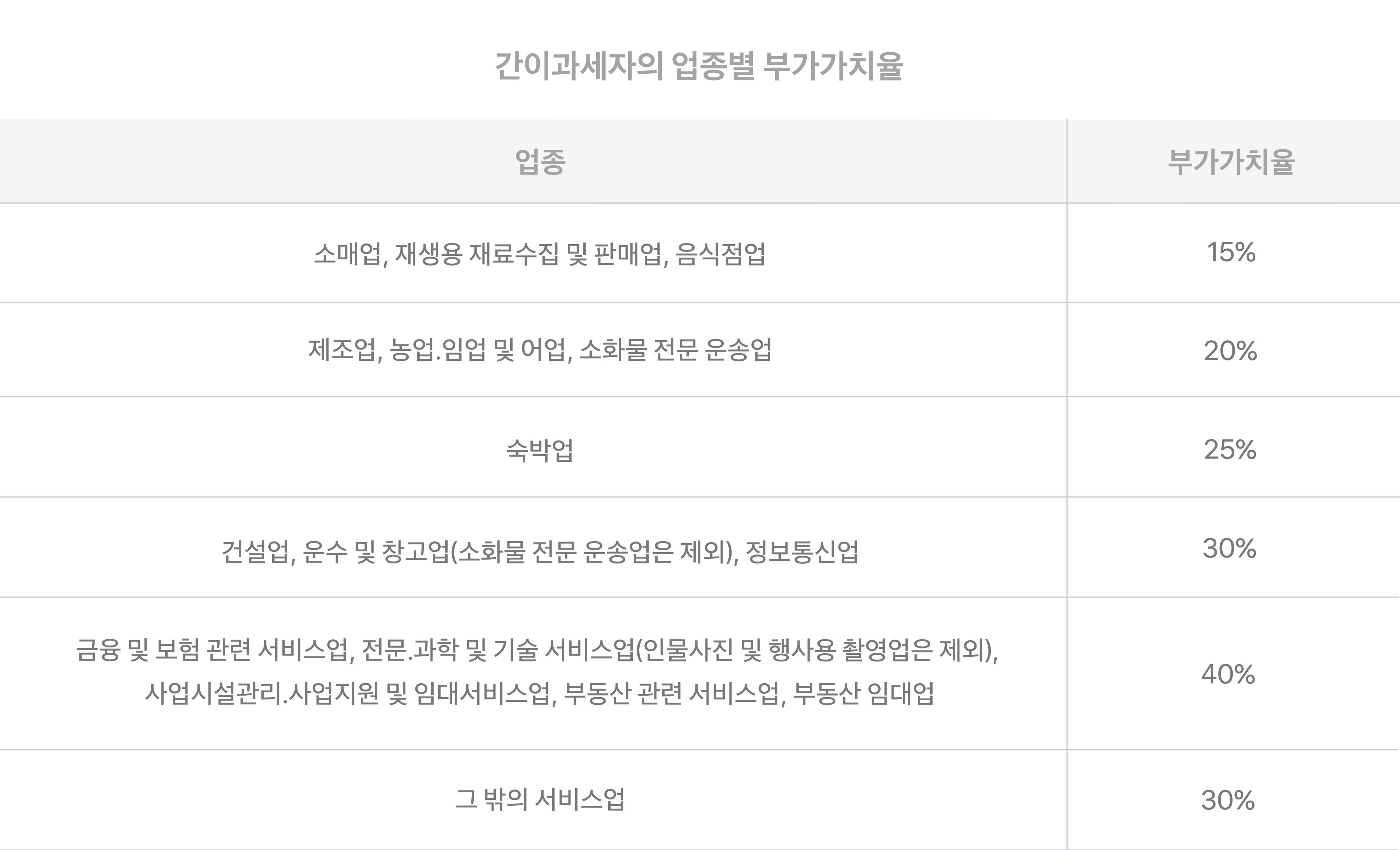 간이과세자는 연간 매출액이 1억 4천만 원 미만인 사업자로서 업종별로 다른 부가가치율이 적용되고, 매입액(공급대가)의 0.5%만 공제받을 수 있어요. 업종별로 얼마의 부가가치율이 적용되는지 자세히 알고 싶으시다면 아래 이미지를 참고해 주세요.