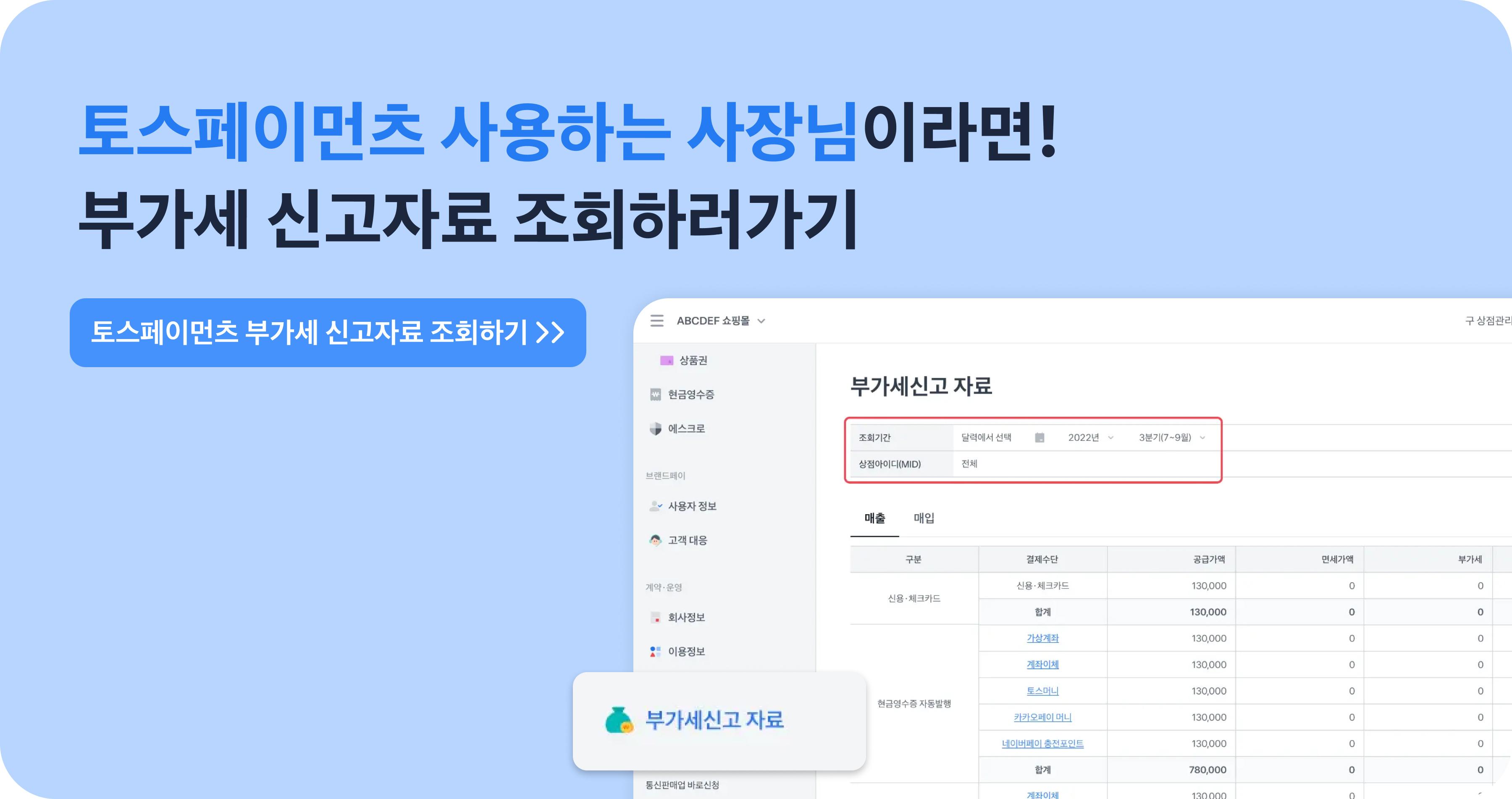 토스페이먼츠 PG를 사용하는 사장님들이라면 손쉽게 부가세 신고자료 조회가 가능해요!